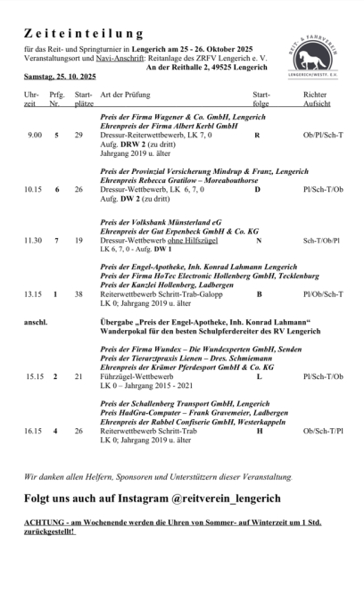 Jedes Jahr veranstaltet der Reit- und Fahrverein Lengerich e.V. Turniere, die Dressur- und SpringreiterInnen, sowie Voltigiergruppen auffordern sich zu beweisen.
